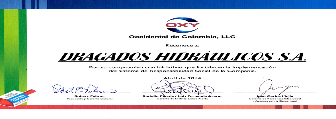 Occidental de Colombia, reconoce a Dragados Hidráulicos el compromiso permanente con el desarrollo de iniciativas que fortalecen la implementación del sistema de Responsabilidad Social de la Compañía