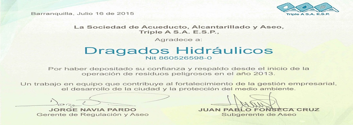 La empresa Triple A nos avala como una empresa que realiza el manejo integral de sus residuos especiales y peligrosos, dando cumplimiento a la resolución No. 1446 del 05 de octubre de 2005 del Ministerio de Medio Ambiente
